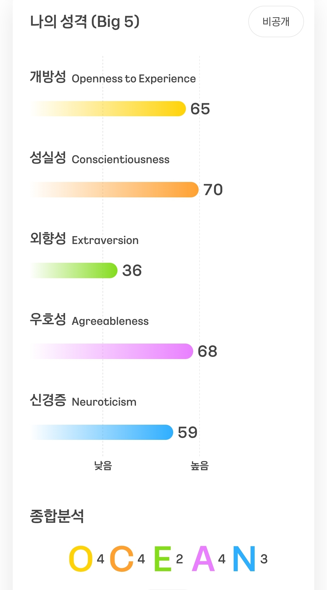 성격은 행동과 반응을 결정하는 패턴입니다. 검증된 Big 5 성격검사로 당신이 몰랐던 진짜 당신을 마주해보세요. 모든 테스트를 완료하면 종합분석을 확인할 수 있어요.